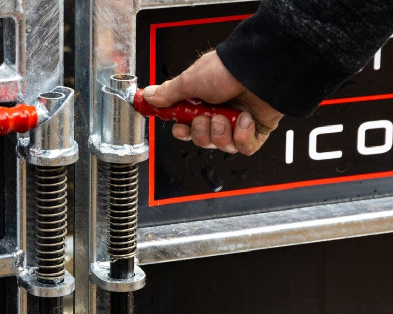 - Dual yoke operating levers enable the yoke to be controlled from the front or rear of the crush. Both can disengage from use for safety.