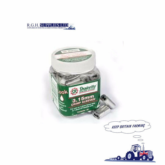 Pottle of 50 Crimp Sleeves 3.15mmFor use on 2.50mm to 3.15mm (12 ½ to 10 gauge) fencing wire. Can also be used on 1.6mm HT barbed wire.Crimp from one end overlapping each crimp to eliminate shoulders. Water resistant grit...Regular price £21.95Regular price £21.95 -