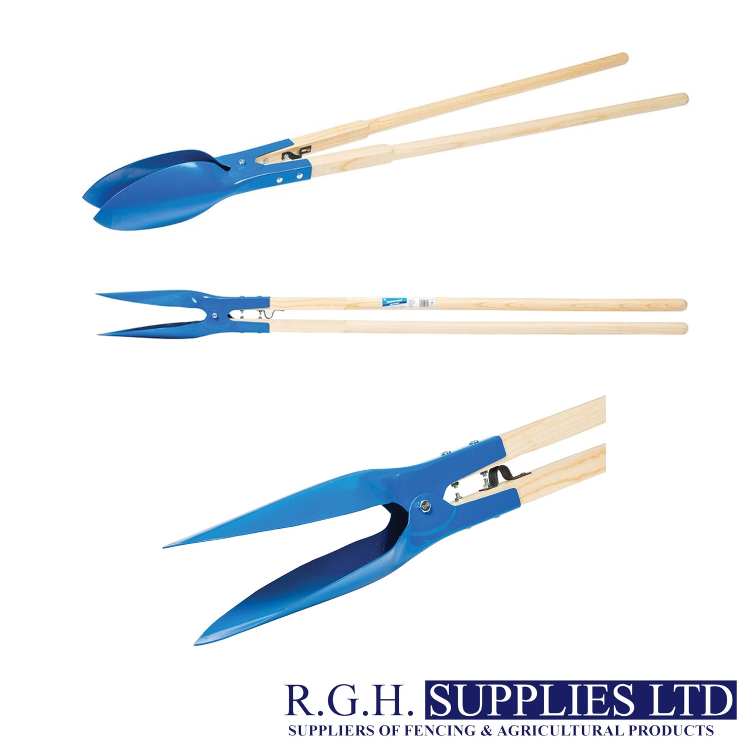 Pressed and hardened steel blades shaped like pointed leaves for easy soil penetration. Dome-end, lacquered, 1200mm hardwood handles with pinch protector. 300 x 150mm blades create holes suitable for 5" / 125mm posts. Blade design reduces level of backfill needed. Weight 3kg.