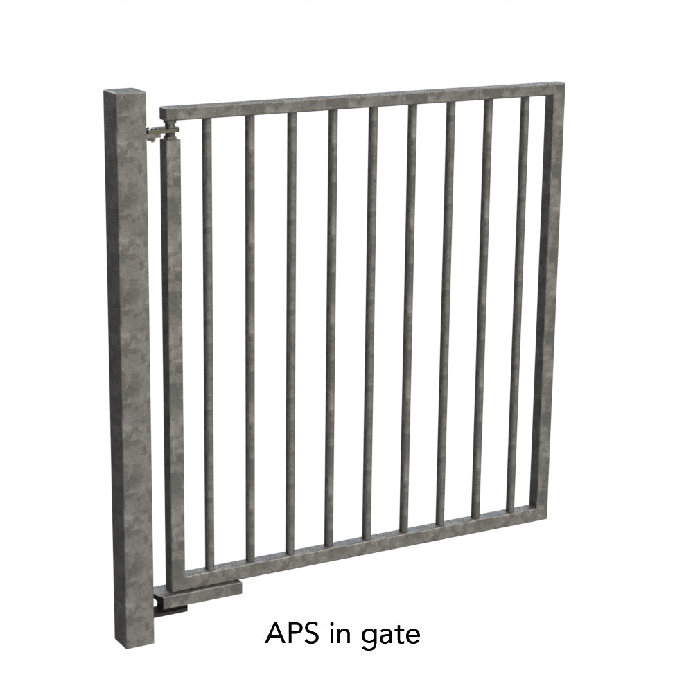 The hydraulic APS closer safely and reliably closes gates up to 150kg. Mounted and welded underneath the gate, the unit is therefore unobtrusive and hidden inside its own steel case. It also acts as a load-bearing lower hinge. This unit is highly vandal resistant. It can be used for right and left handed gates. It does not require any power either.