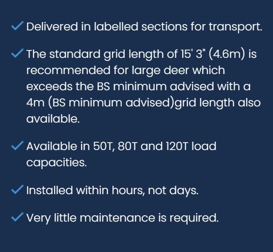 With the unique quick-fit design for rapid installation the hopkins deer grids are a very cost effective access solution.