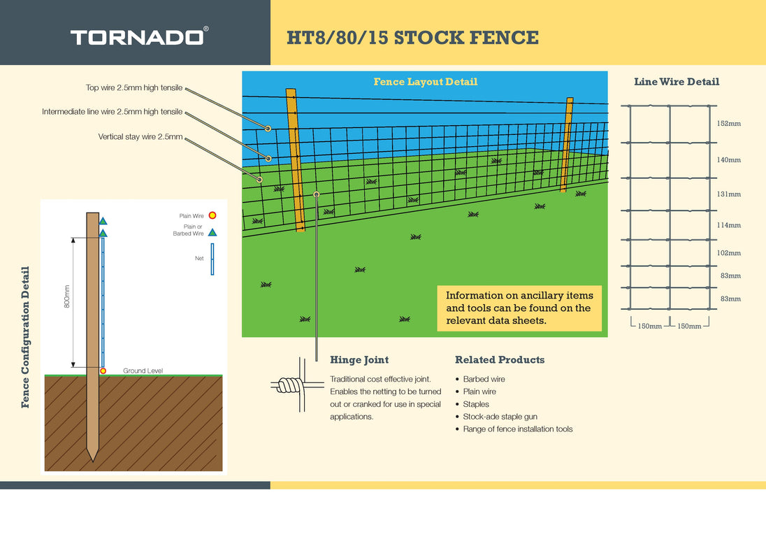 HT8/80/15 is the most widely used specification of high tensile stock fence. Tornado HT Stock fence is manufactured with high tensile wire which can be strained tighter than mild steel and so requires fewer intermediate posts and also it's quicker to erect. It does not stretch with weathering so does not need to be re tightened annually.