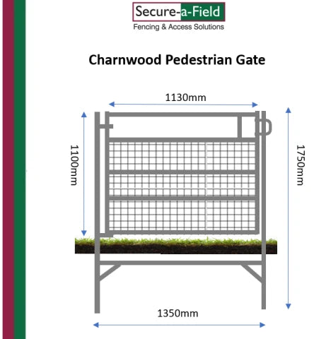 COMPONENTS: Galvanised steel 5 rail gate with weld mesh to lower half | Integral steel 'H' frame gate posts | Self-closing heavy duty hinge system| Sprung handle and auto-catches | Anti-tamper fixings used throughout | Two-way opening conversion kit and polyester powder coated finish available as an optional extra | Gate height at 1.1m, gate leaf width at 1.13m, overall width at 1.35m.