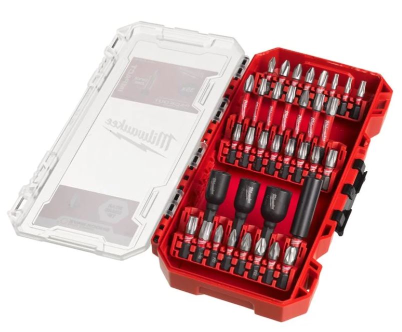 SHOCKWAVE™ screwdriving bits: 24 x 25 mm length 1 x PH1 / 3 x PH2 / 1 x PH3, 2 x PZ1 / 3 x PZ2 / 1 x PZ3, 2 x TX10 / 2 x TX15 / 3 x TX20 / 3 x TX25 / 2 x TX30 / 1 x TX40. 7 x 50 mm length 1 x PH2 / 1 x PZ2, 1 x TX15 / 1 x TX20 / 1 x TX25 / 1 x TX30 / 1x TX40. 3 x SHOCKWAVE™ magnetic nut drivers: 48 mm length 1 x Hex 7 mm / 1 x Hex 8 mm / 1 x Hex 10 mm. 1 x SHOCKWAVE™ magnetic bit holder 60 mm length