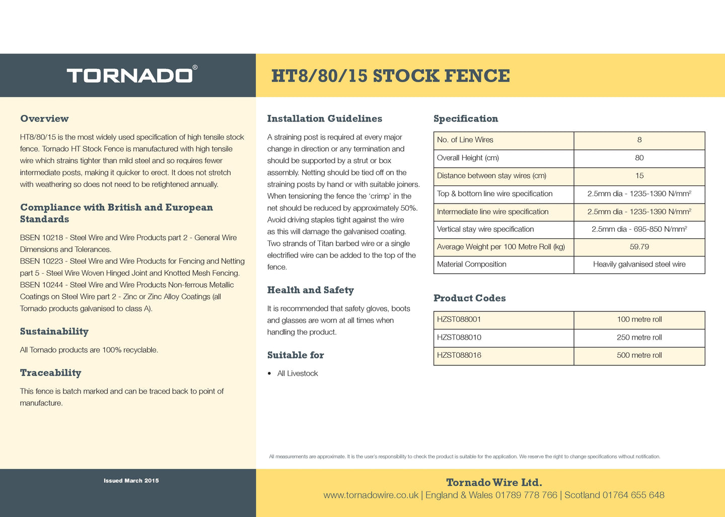 HT8/80/15 is the most widely used specification of high tensile stock fence. Tornado HT Stock fence is manufactured with high tensile wire which can be strained tighter than mild steel and so requires fewer intermediate posts and also it's quicker to erect. It does not stretch with weathering so does not need to be re tightened annually.